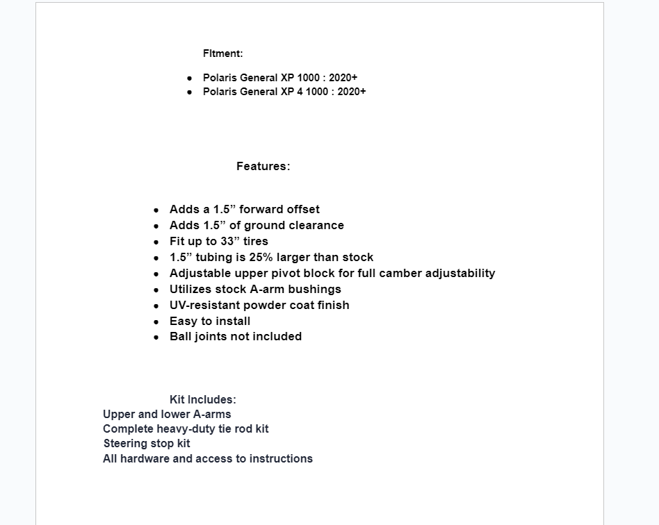 More ground and tire clearance make these Polaris General A-arms an all-around upgrade. With 1.5″ high-clearance bends, you’ll cruise over more obstacles like they weren’t even there. The 1.5″ forward offset boosts stability and tire clearance so you have room for 33″ tires. You get awesome performance without overhauling your whole ride.