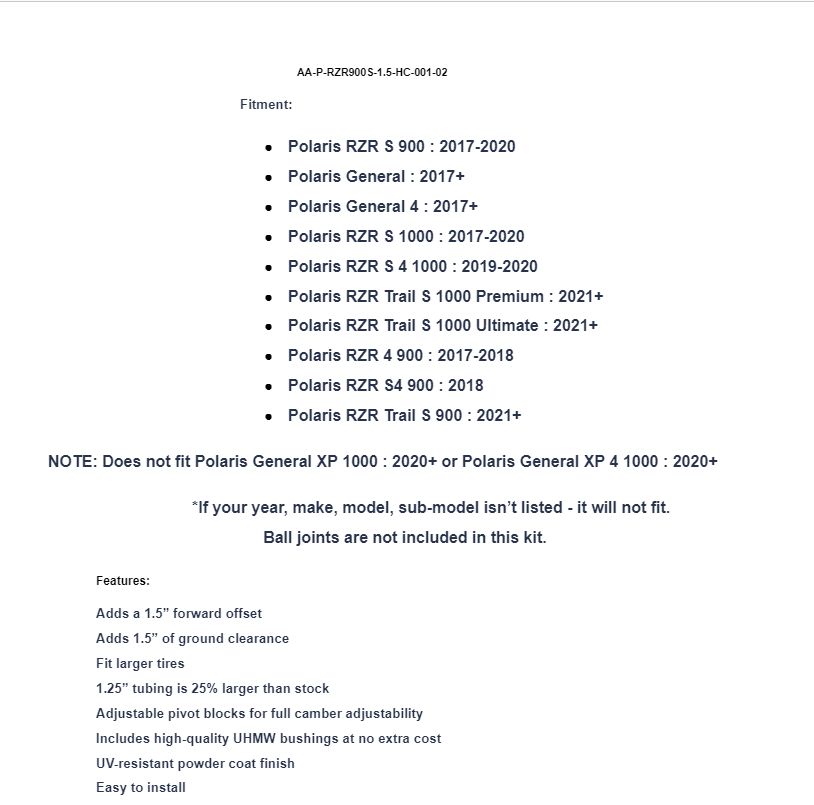 NOTE: Does not fit Polaris General XP 1000 : 2020+ or Polaris General XP 4 1000 : 2020+
