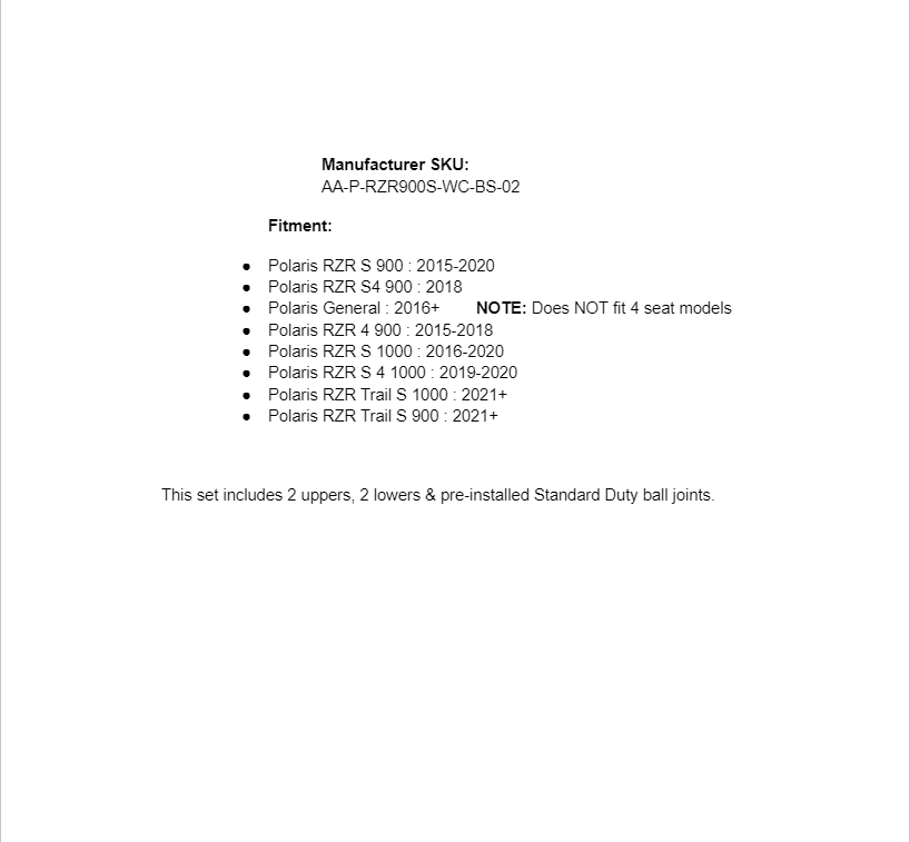 This set includes 2 uppers, 2 lowers & pre-installed Standard Duty ball joints.