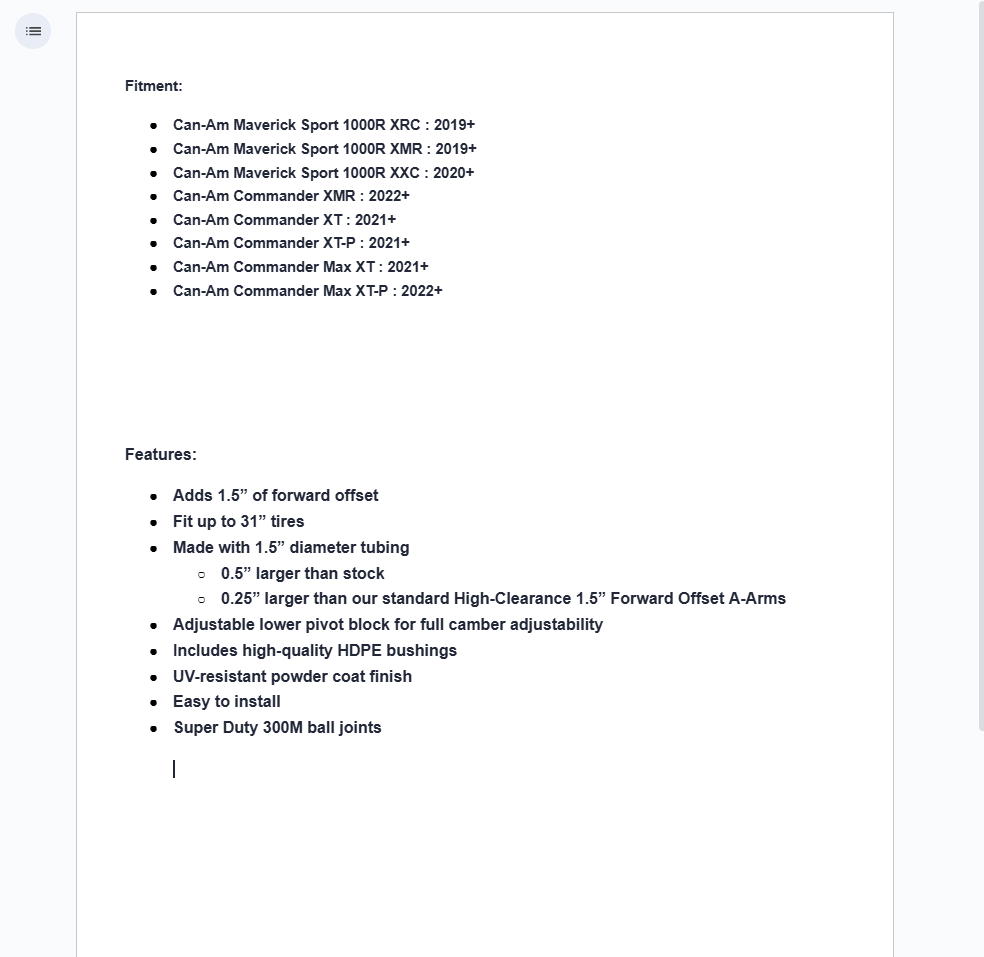 All of your buddies are bragging about their new UTV parts. Just wait until they see your SuperATV Can-Am Maverick Sport Atlas Pro 1.5 Forward Offset A-Arms—those will earn you some bragging rights. They’re high clearance, burly, and super strong, making your side-by-side look like a tank. How’d we do it? We took our standard A-arms and improved their design— making the tubing 1.5″ in diameter and 0.5” larger than your OEM A-Arms. Plus, we’ve added a 1.5” offset for more stability and room for 31” tires.