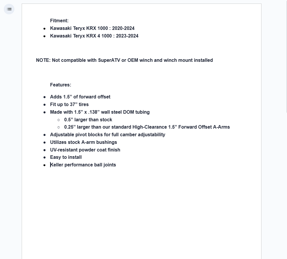 Outride your buddies with SuperATV’s Kawasaki Teryx KRX 1000 Atlas Pro 1.5” Forward Offset A-Arms. They’re beefy and stronger than any A-arms we’ve ever made. We know what kind of terrain you’re facing, so these A-arms were designed to battle. We’ve increased the tubing to 1.5″ in diameter, making them .5″ larger than stock and .25″ larger than our standard A-arms. Everyone will know you mean business on the trail with a 1.5” offset and up to 37” tires with these Teryx A-arms installed.