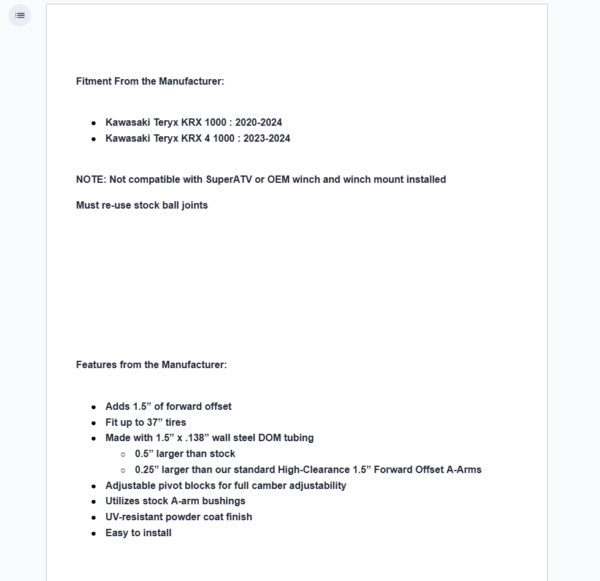 Outride your buddies with SuperATV’s Kawasaki Teryx KRX 1000 Atlas Pro 1.5” Forward Offset A-Arms. They’re beefy and stronger than any A-arms we’ve ever made. We know what kind of terrain you’re facing, so these A-arms were designed to battle. We’ve increased the tubing to 1.5″ in diameter, making them .5″ larger than stock and .25″ larger than our standard A-arms. Everyone will know you mean business on the trail with a 1.5” offset and up to 37” tires with these Teryx A-arms installed.