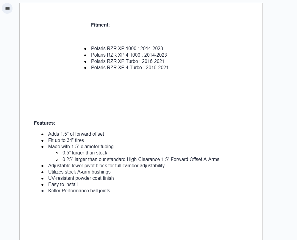 All of your buddies are bragging about their new UTV parts. Just wait until they see your SuperATV Polaris RZR XP Atlas Pro 1.5” Forward Offset A-Arms with Keller Performance Ball joints—those will earn you some bragging rights. They’re high clearance, burly, and super strong, making your side-by-side look like a tank. How’d we do it? We took our standard A-arms and improved their design— making the tubing 1.5″ in diameter and 0.5” larger than your OEM A-Arms. Plus, we’ve added a 1.5” offset for more stability and room for 34” tires.