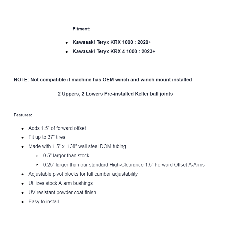 - 0.25” larger than our standard High-Clearance 1.5” Forward Offset A-Arms