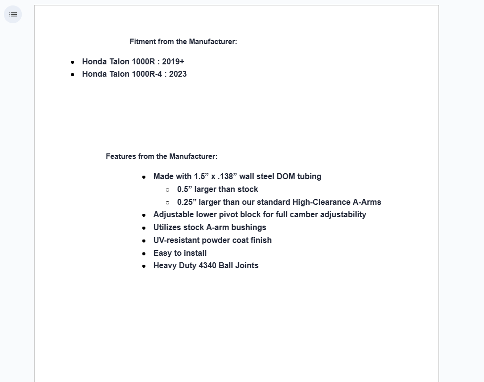 Choose adjustable pivot blocks to get full control of your camber. Our Honda Talon control arms come preadjusted to factory specs right out of the box so you can install and go. So if you add weight from accessories or get a small lift, you can adjust your camber to get a better ride and reduce premature tire wear.