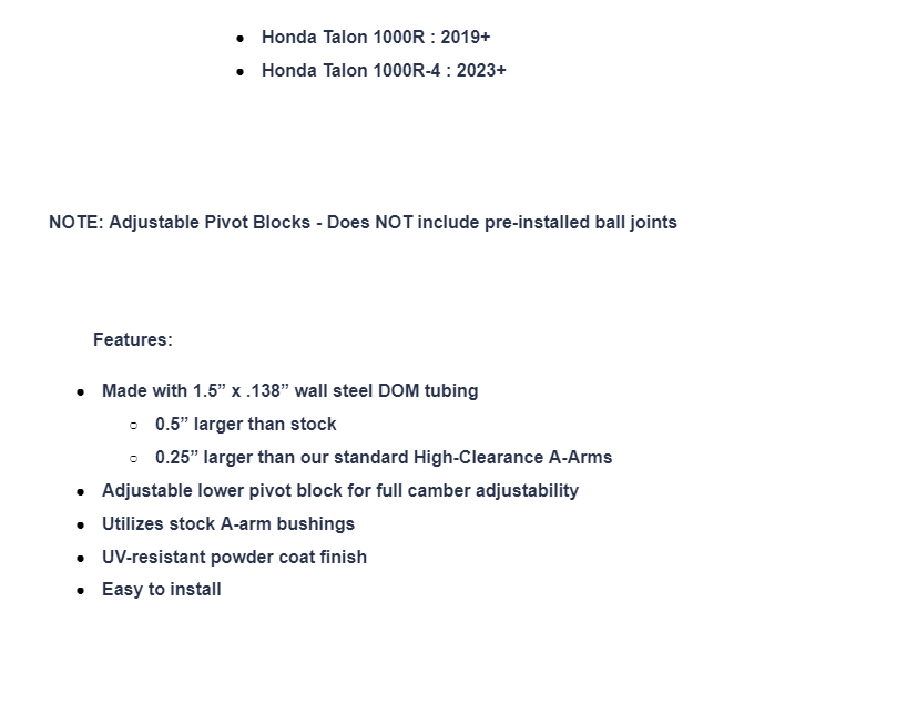 Choose adjustable pivot blocks to get full control of your camber. Our Honda Talon control arms come preadjusted to factory specs right out of the box so you can install and go. So if you add weight from accessories or get a small lift, you can adjust your camber to get a better ride and reduce premature tire wear.