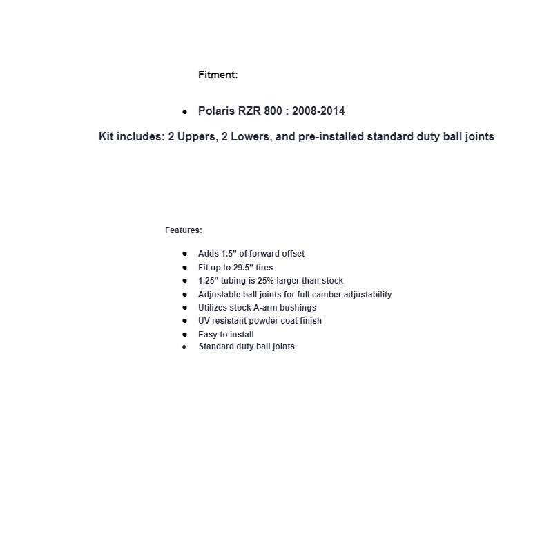 You want bigger tires to tackle bigger obstacles, but you don’t want a lift that’s hard to handle and makes you feel unstable. You need SuperATV’s High-Clearance 1.5” Forward Offset A-Arms for your Polaris RZR 800. They increase your wheel base by 1.5 inches, so you get more stability, room for up to 29.5” tires, and more strength than stock. It will make your ride better.