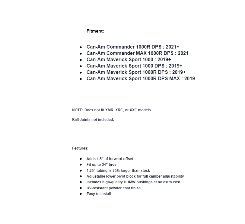The sleek, tubed design of these control arms makes your Maverick Sport look downright awesome. But we didn’t just want them to look good—we wanted them to blow all other A-arms out of the water in terms of strength, too. So we started with 1.25” tubing that’s 25% larger than stock, and then powder coated it for extra durability and longevity. To make your life easier, we’re also including UHMW bushings with your purchase. UHMW is nearly indestructible and virtually frictionless, and these bushings are self-lubricating, so they get smoother the longer you ride. The included bushings save you time, money, and hassle, leaving you free to focus on what really matters: enjoying the ride.