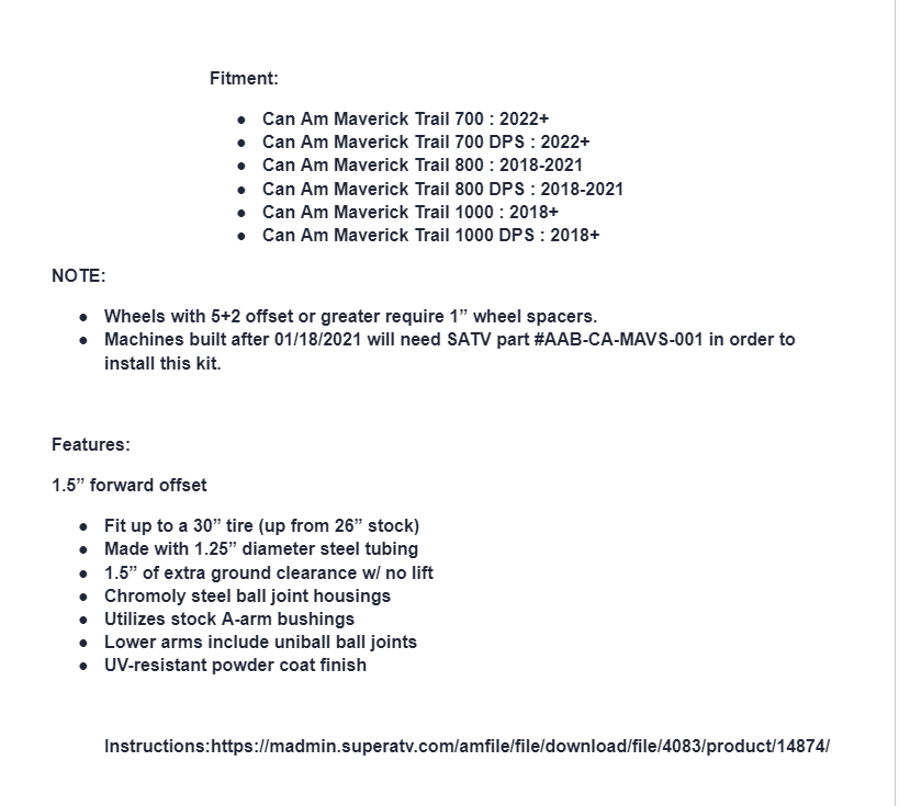 Your Maverick Trail is rugged and it’s built for the off-road. If you want it to truly handle everything you encounter, you need to upgrade to SuperATV’s High-Clearance 1.5” Forward Offset A-Arms for the Can-Am Maverick Trail. They’re stronger, come with full camber adjustment, and increase your wheelbase by 1.5 inches for more stability and room for up to 30” tires. It’s a win-win.