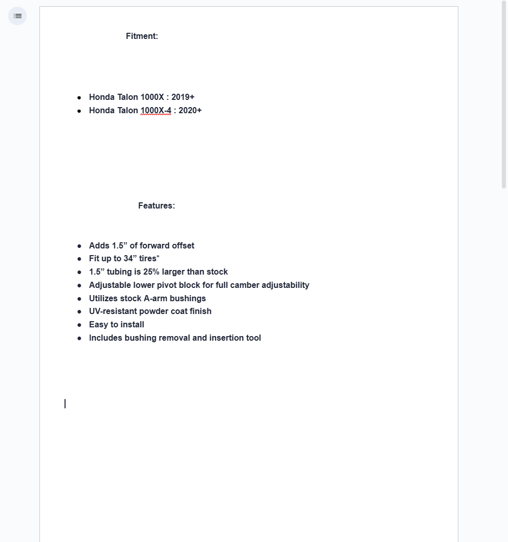 Your Talon is rugged and it’s built for the off-road. If you want it to truly handle everything you encounter, you need to upgrade to SuperATV’s High-Clearance 1.5” Forward Offset A-Arms for the Honda Talon 1000X. They’re stronger, come with full camber adjustment, and increase your wheelbase by 1.5 inches for more stability and room for up to 34” tires. It’s a win-win.