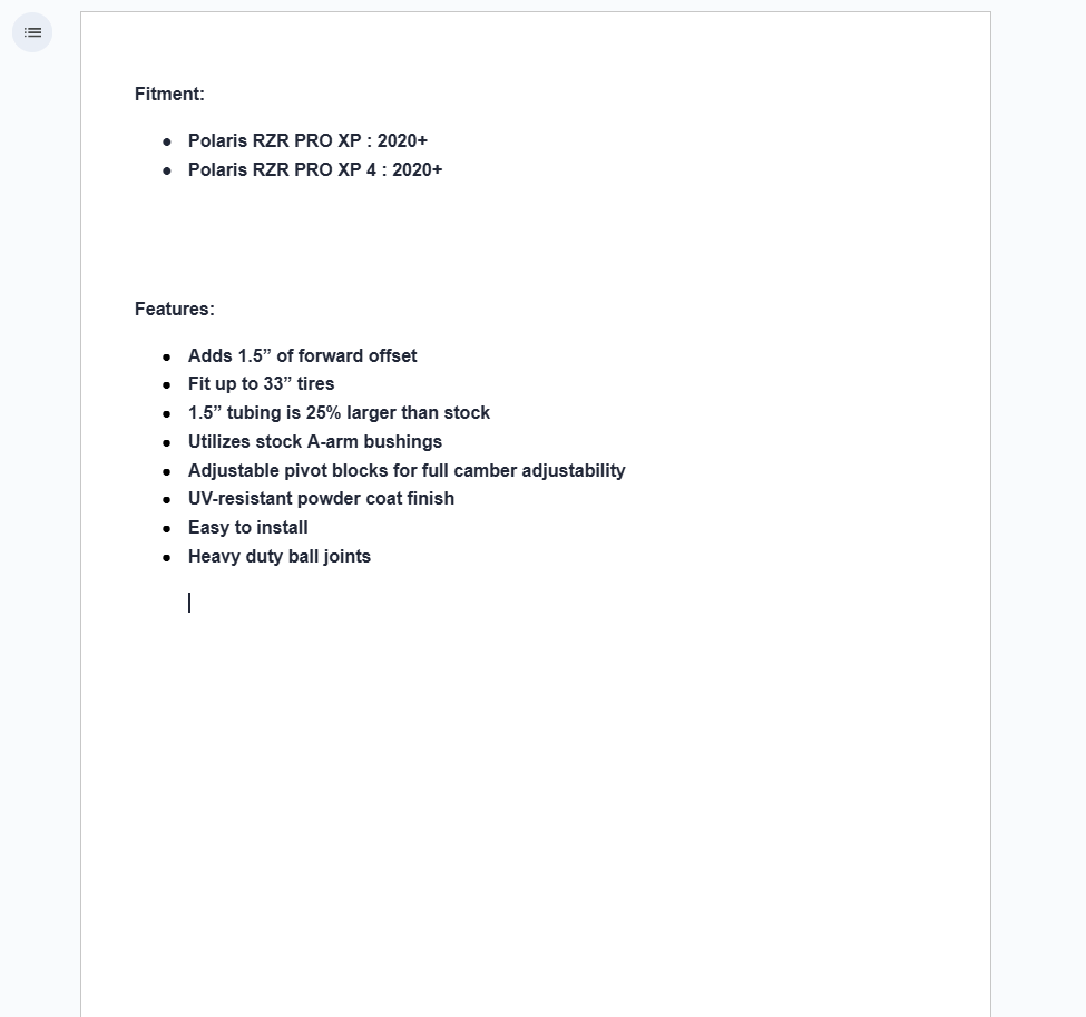 Whether it’s a quick evening ride or a long weekend adventure, the last thing you want is for that trip to be cut short. If you’re running weak A-arms, all it takes is one unfortunate rock or stump before your suspension is shot to hell, canceling the rest of your ride. Luckily, SuperATV has what it takes to keep your Polaris RZR PRO XP going strong over the roughest trails and rock gardens. Our High Clearance 1.5” Forward Offset A-Arms are made with tubing that’s 25% larger than stock, making them more dependable. You also get more stability while covering rough ground and the ability to adjust your camber, delivering the ultimate UTV suspension upgrade.