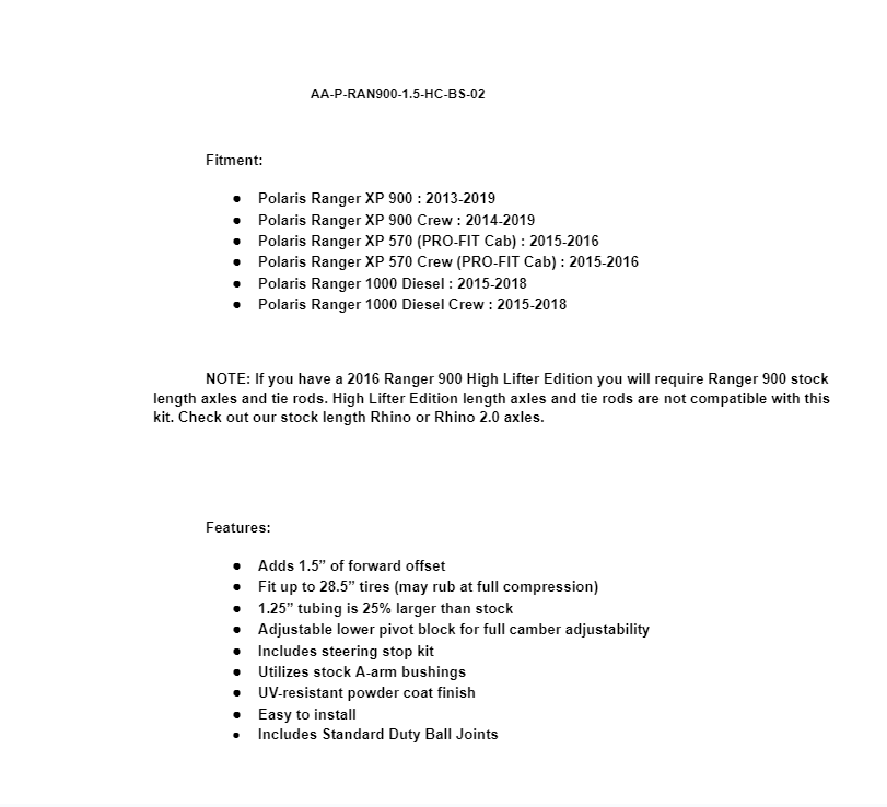 NOTE: If you have a 2016 Ranger 900 High Lifter Edition you will require Ranger 900 stock length axles and tie rods. High Lifter Edition length axles and tie rods are not compatible with this kit. Check out our stock length Rhino or Rhino 2.0 axles.