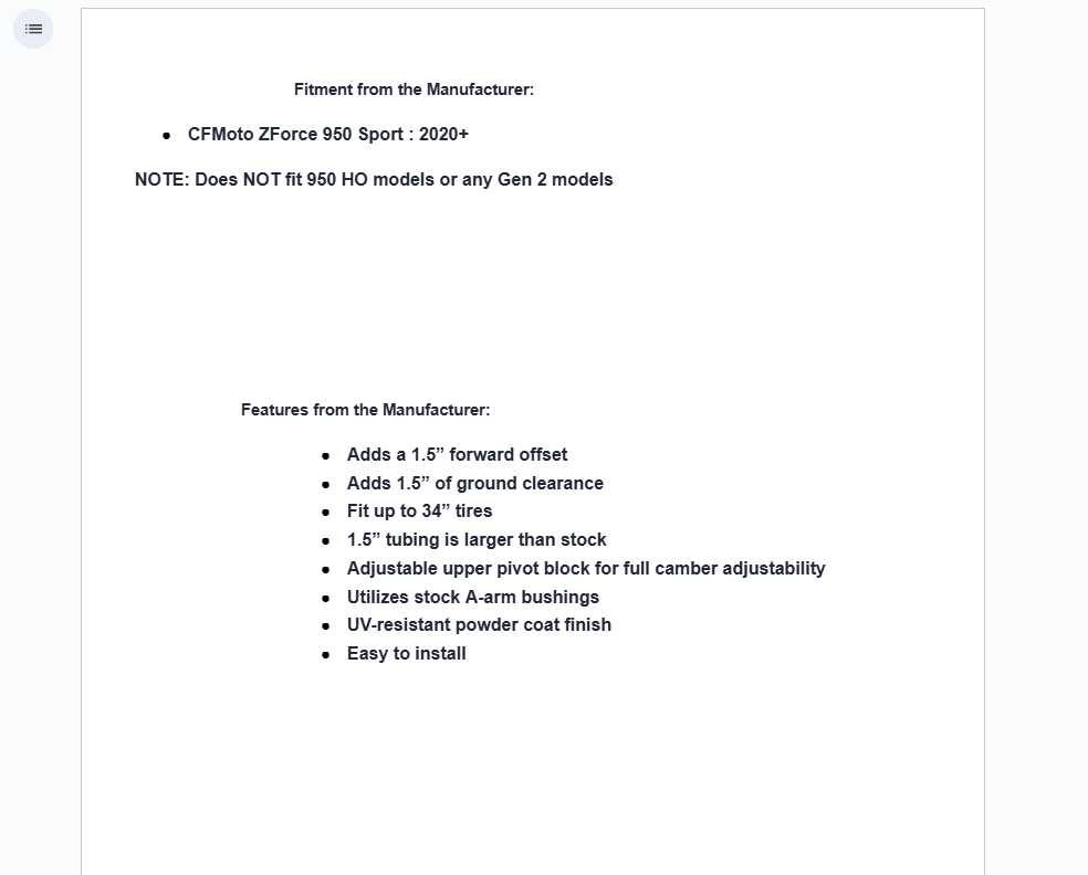 Your CFMOTO ZForce 950’s stock A-arms will only take you so far. To make your ride truly unstoppable, you need SuperATV’s High-Clearance 1.5” Forward Offset A-Arms. They’re larger and stronger than stock so you can tear up rough trails without a second thought. Our control arms feature a bend design for an additional 1.5” of ground clearance and they have an offset, too. That means you can bump up your tire size without installing a lift kit! All in all, SuperATV A-arms deliver strength, performance, and good looks that you won’t find anywhere else.