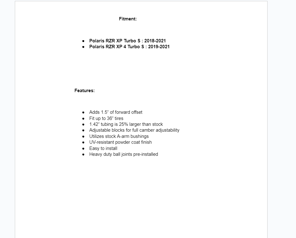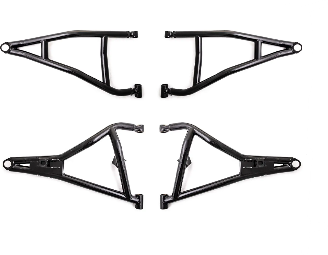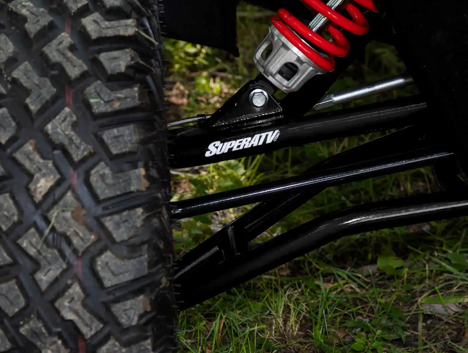 You want bigger tires to tackle bigger obstacles, but you don’t want a lift that’s hard to handle and makes you feel unstable. You need SuperATV’s High-Clearance 1.5” Forward Offset A-Arms for your Polaris RZR XP Turbo S. They increase your wheel base by 1.5 inches, so you get more stability, room for up to 36” tires, and more strength than stock. It will make your ride better.