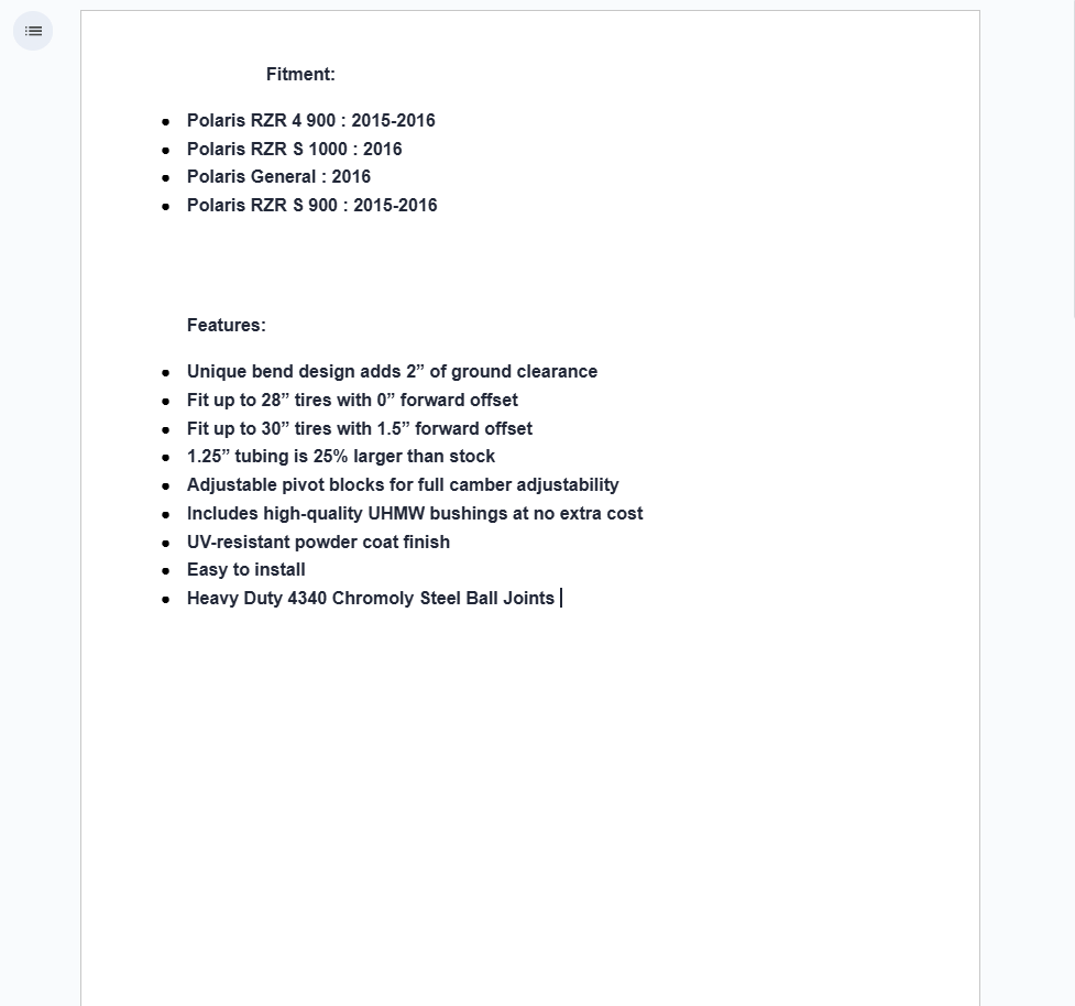 You’re not truly getting the most out of your ride if you haven’t replaced that stock suspension with stronger, more long-lasting parts from SuperATV. Our 1.5” Forward Offset A-Arms will have your Polaris RZR 4 900 sailing over rough and rugged terrain like it’s nothing, allowing you to ride harder without worry. Our A-arms offer extra ground clearance and adjustable pivot blocks, and they’re bigger and stronger than your stock arms. And the offset gives you room for massive 30” tires. The only thing you’ll regret is not upgrading sooner.