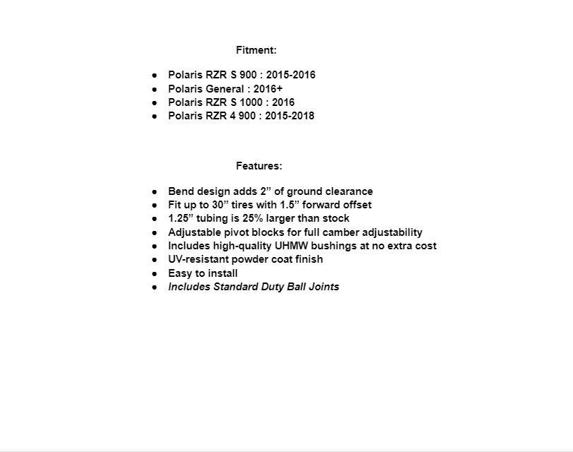 You’re not truly getting the most out of your ride if you haven’t replaced that stock suspension with stronger, more long-lasting parts from SuperATV. Our High Clearance A-Arms will have your Polaris RZR S 900 sailing over rough and rugged terrain like it’s nothing, allowing you to ride harder without worry. Our A-arms offer extra ground clearance and adjustable pivot blocks, and they’re bigger and stronger than your stock arms. The only thing you’ll regret is not upgrading sooner.