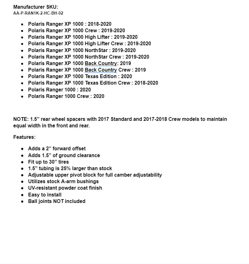 NOTE: 1.5” rear wheel spacers with 20118-2020 Standard and 2017-2018 Crew models to maintain equal width in the front and rear.