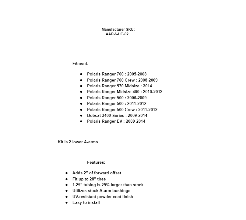 It doesn’t matter where, when, or how you ride—we can all agree on one thing: more ground clearance and stronger suspension is always a good thing. That’s exactly what you get when you install SuperATV’s High Clearance 2” Forward Offset A-Arms on your Polaris Ranger 700. Our A-arms are bigger and stronger than your stock arms, so you’ll never have to worry about taking it easy for their sake. The 2” forward offset give you more stability and room for bigger tires. If you want a suspension upgrade that’s built to perform and won’t let you down, you need SuperATV.