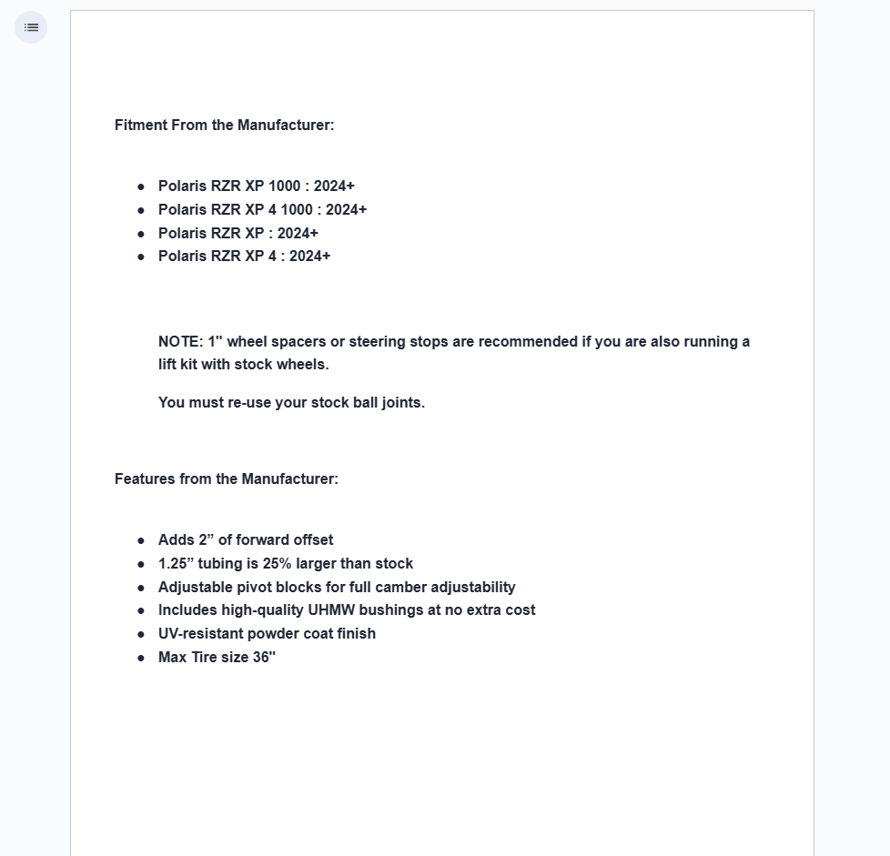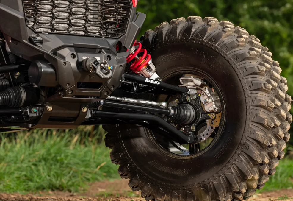 You want bigger tires to tackle bigger obstacles, but you don’t want a lift that’s hard to handle and makes you feel unstable. You need SuperATV’s High-Clearance 2” Forward Offset A-Arms for your Polaris RZR XP 1000. They increase your wheel base by 2 inches, so you get more stability, room for larger tires, and more strength than stock. It will make your ride better.