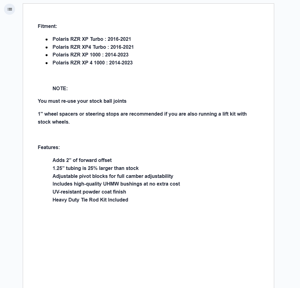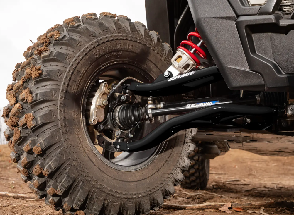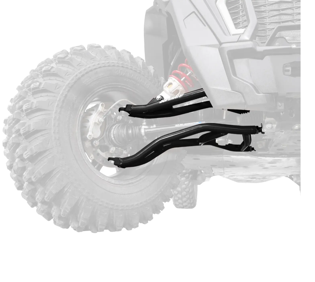 You want bigger tires to tackle bigger obstacles, but you don’t want a lift that’s hard to handle and makes you feel unstable. You need SuperATV’s High-Clearance 2” Forward Offset A-Arms for your Polaris RZR XP Turbo. They increase your wheel base by 2 inches, so you get more stability, room for up to 33” tires, and more strength than stock. It will make your ride better.