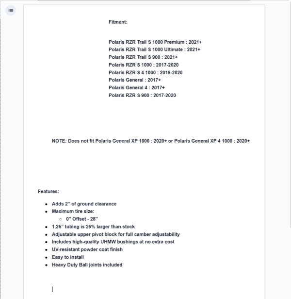 The high clearance bends in the A-arms give you 1.5” of extra ground clearance without a lift. Ride with confidence knowing that you’ll pass right over rocks and branches without issue. Your ride just got smoother.