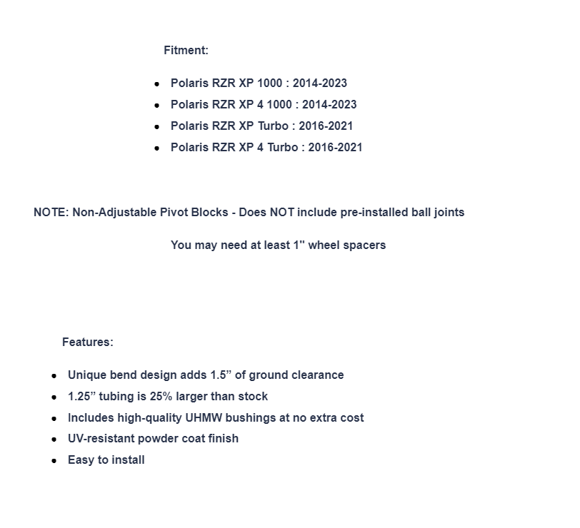Have you ever found yourself going around a rock or stump while all your buddies sailed over it with no problem? If you answered “yes,” it’s probably time to think about giving that stock suspension an upgrade. SuperATV has just what your Polaris RZR XP 1000 needs with our High Clearance A-Arms. A clever bend design delivers extra ground clearance, and the adjustable pivot blocks allow you to adjust your camber as needed. Top it all off with stronger steel and bigger tubing and you’ve got yourself a truly unmatched set of A-arms.