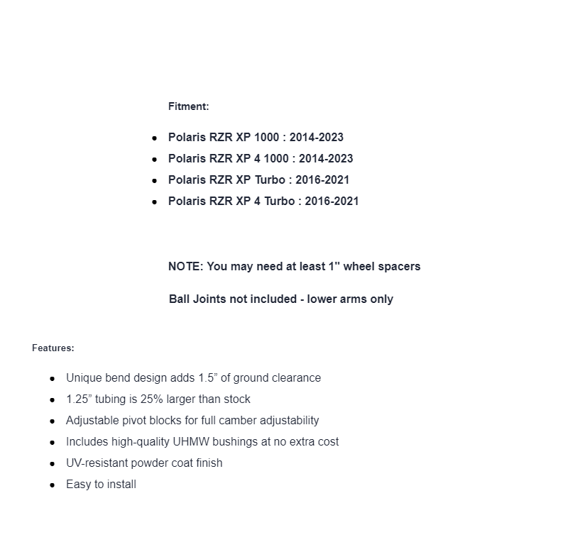 Have you ever found yourself going around a rock or stump while all your buddies sailed over it with no problem? If you answered “yes,” it’s probably time to think about giving that stock suspension an upgrade. SuperATV has just what your Polaris RZR XP 1000 needs with our High Clearance A-Arms. A clever bend design delivers extra ground clearance, and the adjustable pivot blocks allow you to adjust your camber as needed. Top it all off with stronger steel and bigger tubing and you’ve got yourself a truly unmatched set of A-arms.