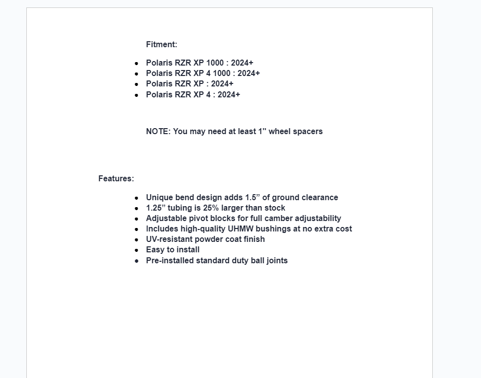 Have you ever found yourself going around a rock or stump while all your buddies sailed over it with no problem? If you answered “yes,” it’s probably time to think about giving that stock suspension an upgrade. SuperATV has just what your Polaris RZR XP 1000 needs with our High Clearance A-Arms. A clever bend design delivers extra ground clearance, and the adjustable pivot blocks allow you to adjust your camber as needed. Top it all off with stronger steel and bigger tubing and you’ve got yourself a truly unmatched set of A-arms.