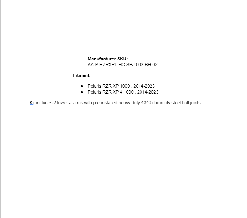 Kit includes 2 lower a-arms with pre-installed heavy duty 4340 chromoly steel ball joints.