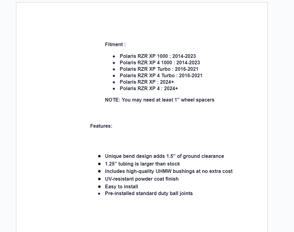 Have you ever found yourself going around a rock or stump while all your buddies sailed over it with no problem? If you answered “yes,” it’s probably time to think about giving that stock suspension an upgrade. SuperATV has just what your Polaris RZR XP 1000 needs with our High Clearance A-Arms. A clever bend design delivers extra ground clearance, and the adjustable pivot blocks allow you to adjust your camber as needed. Top it all off with stronger steel and bigger tubing and you’ve got yourself a truly unmatched set of A-arms.