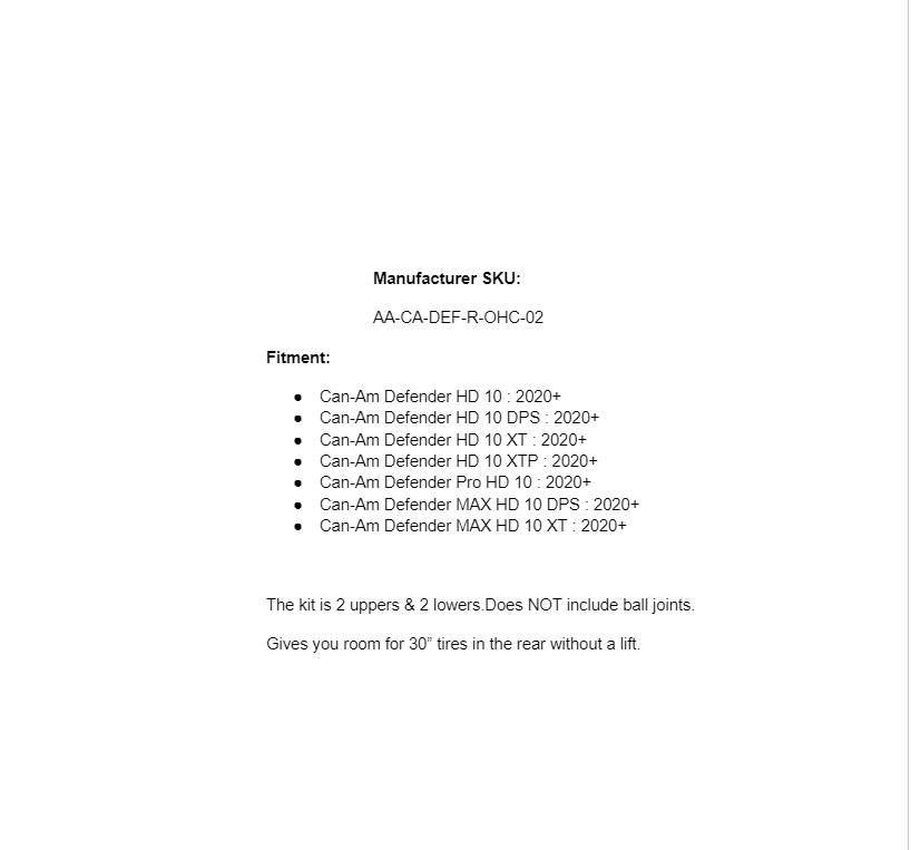 Gives you room for 30” tires in the rear without a lift. Does not include ball joints. The kit is 2 uppers & 2 lowers.