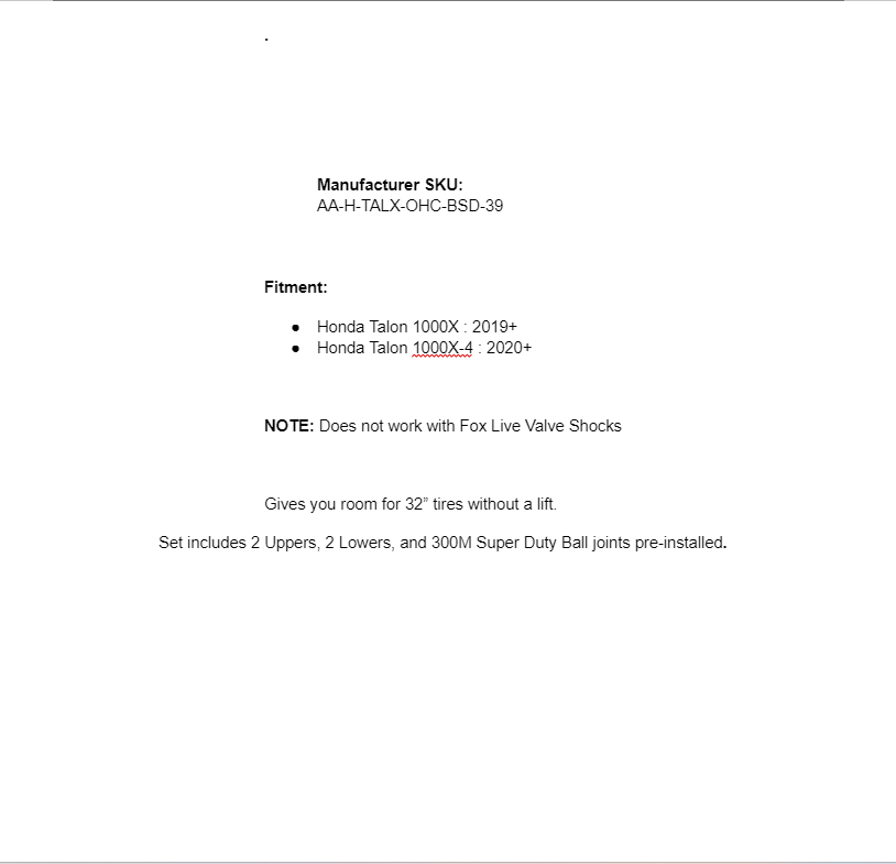 | Honda | Talon 1000X | SXS10S2XD FOX Live Valve | 2022 | |