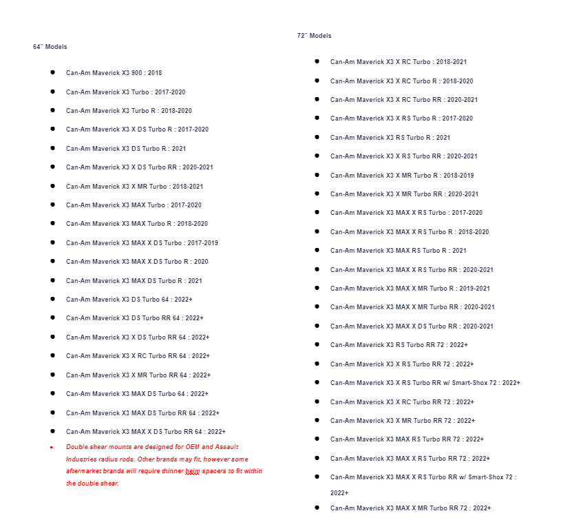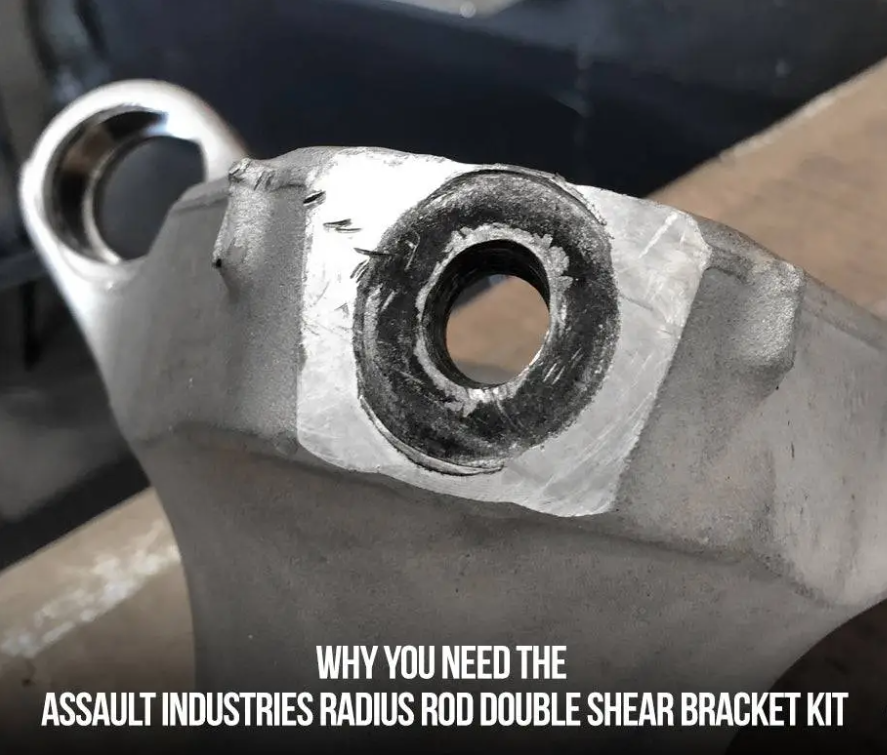 Note: Double shear mounts are designed for OEM and Assault Industries radius rods. Other brands may fit, however some aftermarket brands will require thinner heim spacers to fit within the double shear.