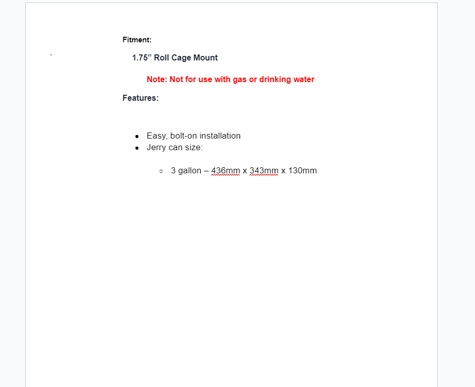 Our jerry can is built for rough rides with thick plastic construction, a sealed lid, and a threaded vent. It won’t leak or spill no matter how rough the ride gets. Your non-potable liquids will stay secure no matter what. It comes with a quick-release mount to make it even easier to attach and detach your can. Plus, the sealed lid doubles as a spout too.