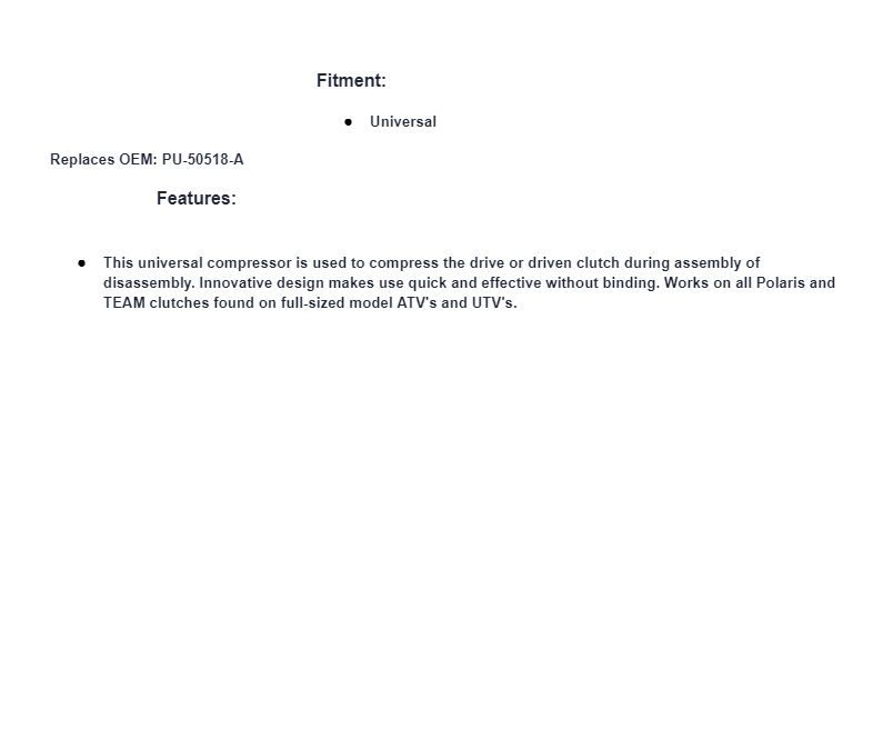 This universal compressor is used to compress the drive or driven clutch during assembly of disassembly. Innovative design makes use quick and effective without binding. Works on all Polaris and TEAM clutches found on full-sized model ATV’s and UTV’s.
