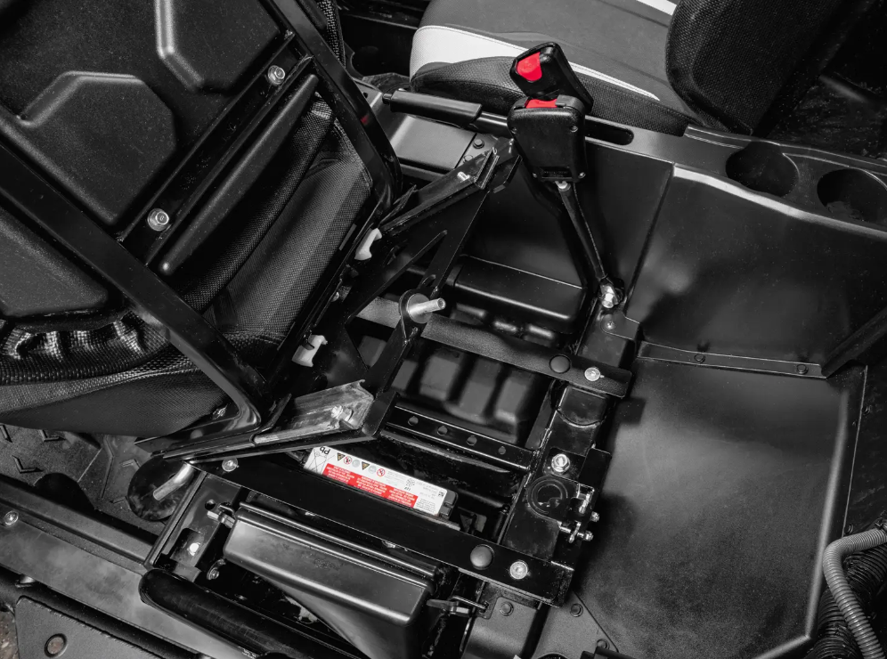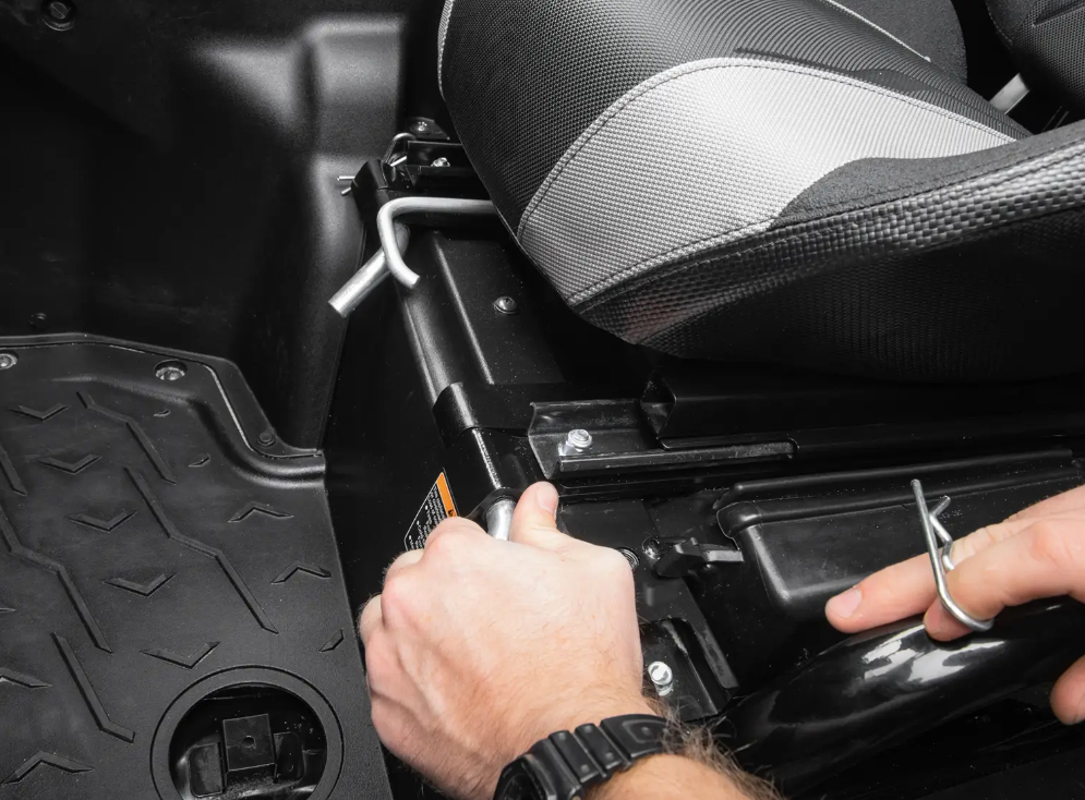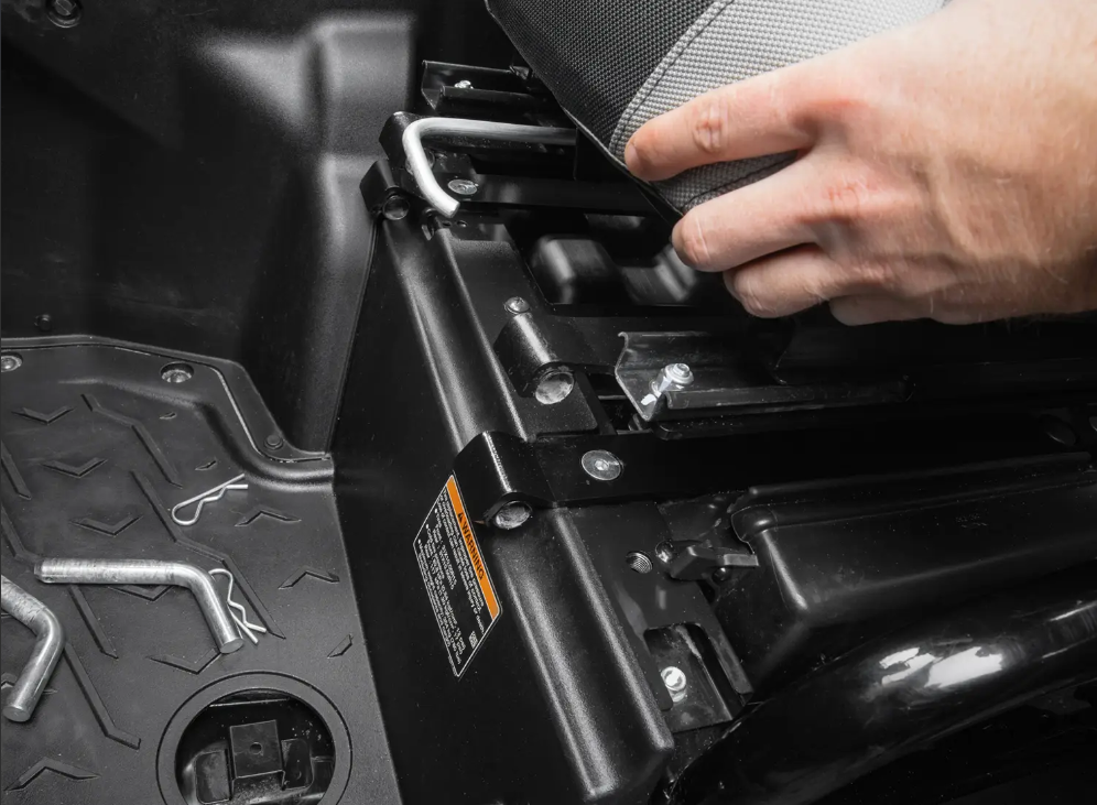 Our KRX 1000 seat tilt kit comes with preassembled passenger and driver’s side seat bases. Once bolted in place, you can pull the lever to tilt them forward and give you access to storage and your air filter. By pulling the pins, you can remove the seats completely to make cleaning up easier. If you want to pack gear without getting frustrated, our flip-up seat base is the way to go.