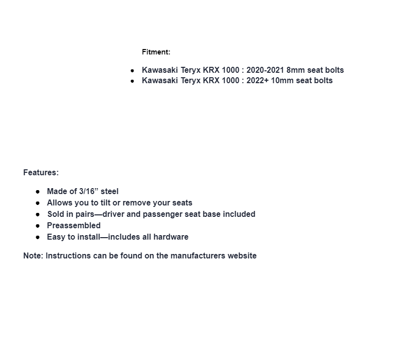 - Kawasaki Teryx KRX 1000 : 2022+ 10mm seat bolts