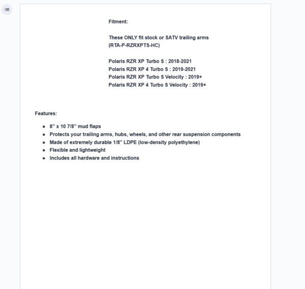 There’s nothing better than pinning your RZRs speedometer on a wild trail. Except all that speed causes your front tires to kick back dirt to your trailing arms, hubs, and wheels. Say goodbye to that sweet paint job, and say hello to corrosion unless you get SuperATV’s Polaris RZR XP Turbo S Mud Flaps. The lightweight LDPE protects your rear suspension from flying debris, so your powder coating doesn’t get blasted.Strong and Flexible Material