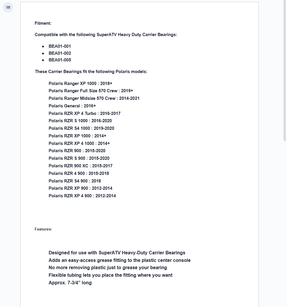 Our grease fitting relocation hose lets you put a grease fitting in the plastic at about ankle height of the center console for easy access. No more popping out the plastic to grease your bearing. That saves you a lot of work when you add grease every 3rd ride like you should. If you take your UTV through mud, water, or sand, you should be adding new grease even more often to push out any contaminants. There’s no easier way to make every ride smooth.