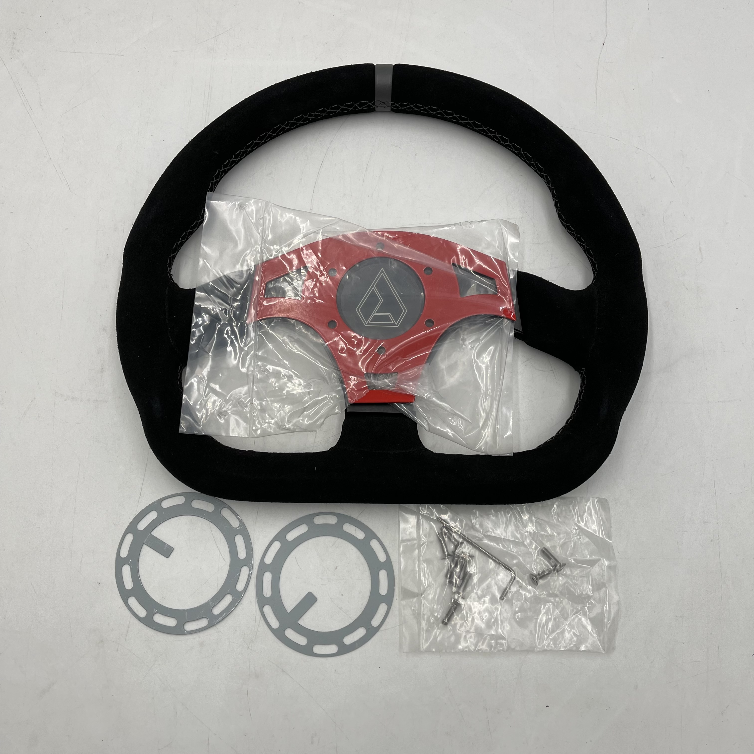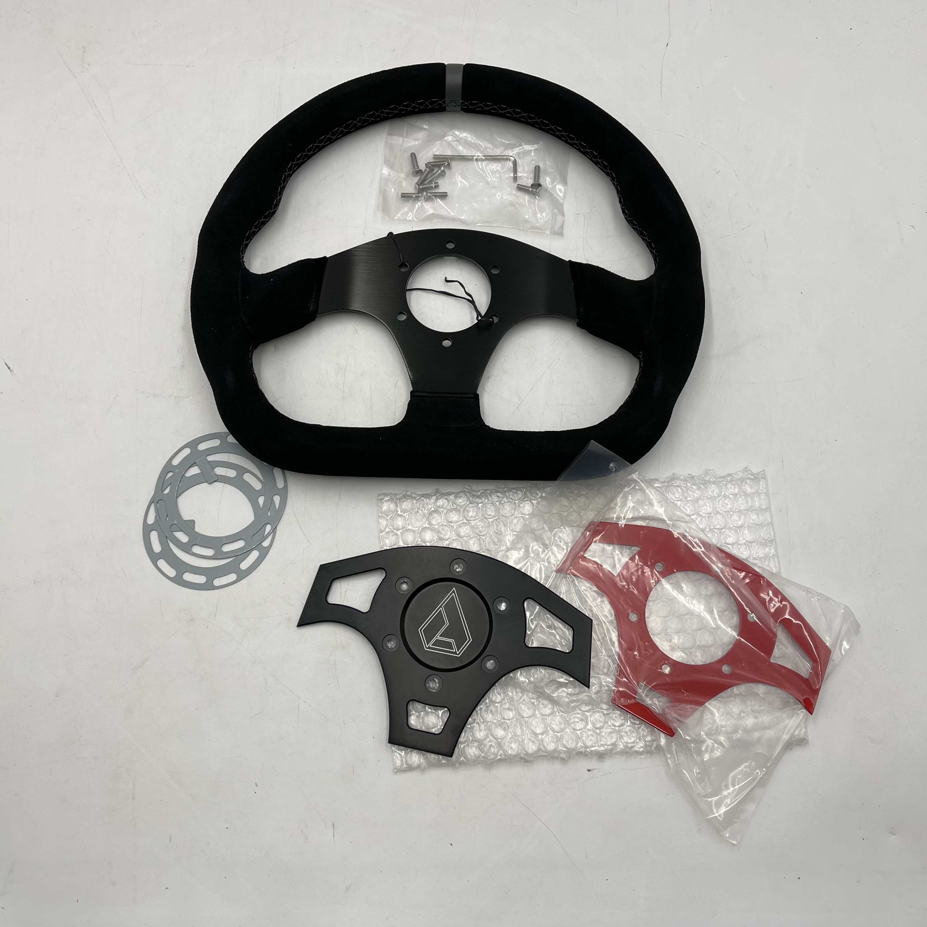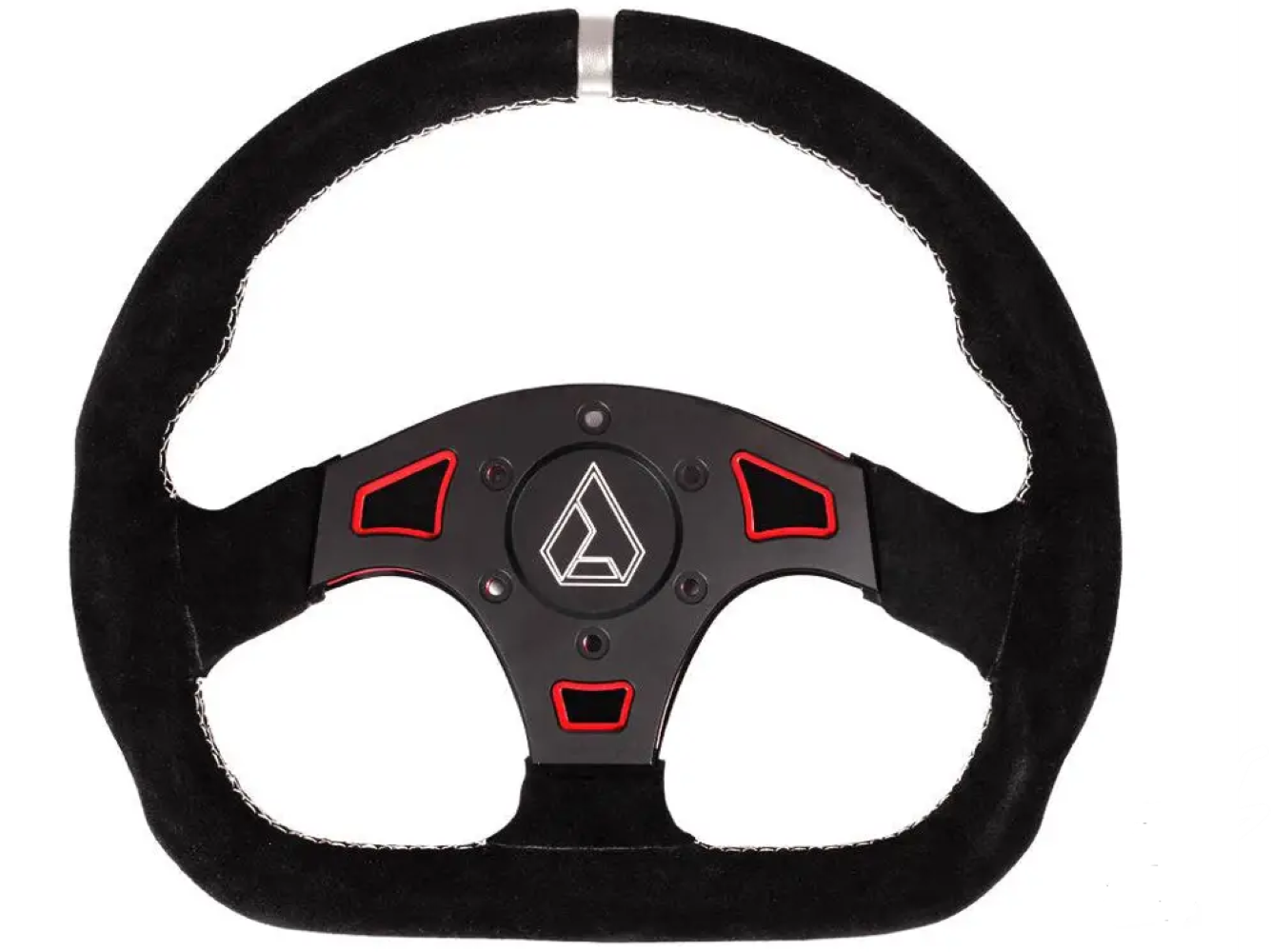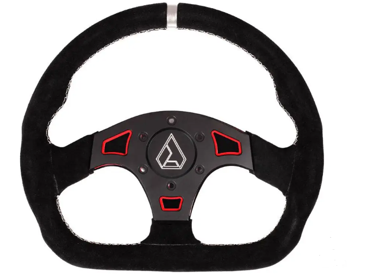 This steering wheel features a fierce design to match your machine. It has a CNC cut aluminum plate with the options of 5 different colored lower plates for added style. And it’s finished in jet-black suede material.