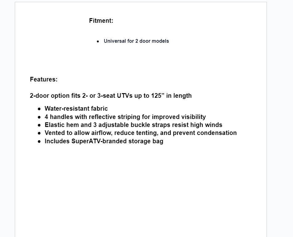 - 2-door option fits 2- or 3-seat UTVs up to 125” in length