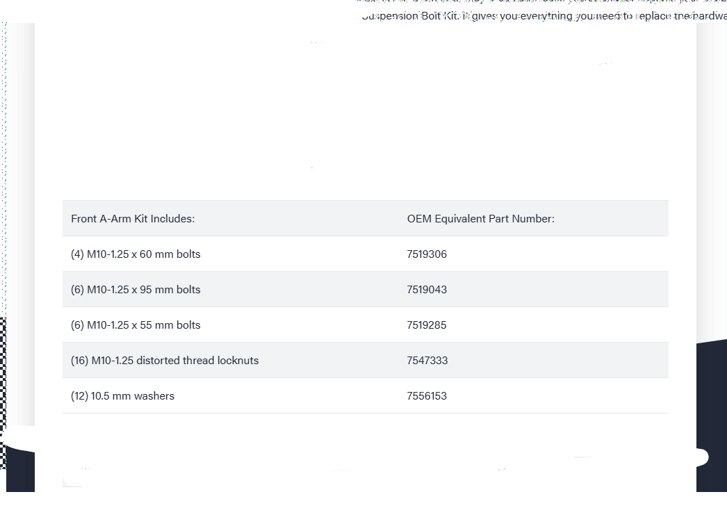 Riding is hard on your suspension hardware. Don’t run them until they break and leave you stranded. Replace your old bolts with our Up & Running Polaris RZR XP 1000 Suspension Bolt Kit. It gives you everything you need to replace the hardware on your A-arms, radius arms, trailing arms, or all three. And since it’s Up & Running, you know it’ll perform just as well as stock without burning a hole in your wallet.