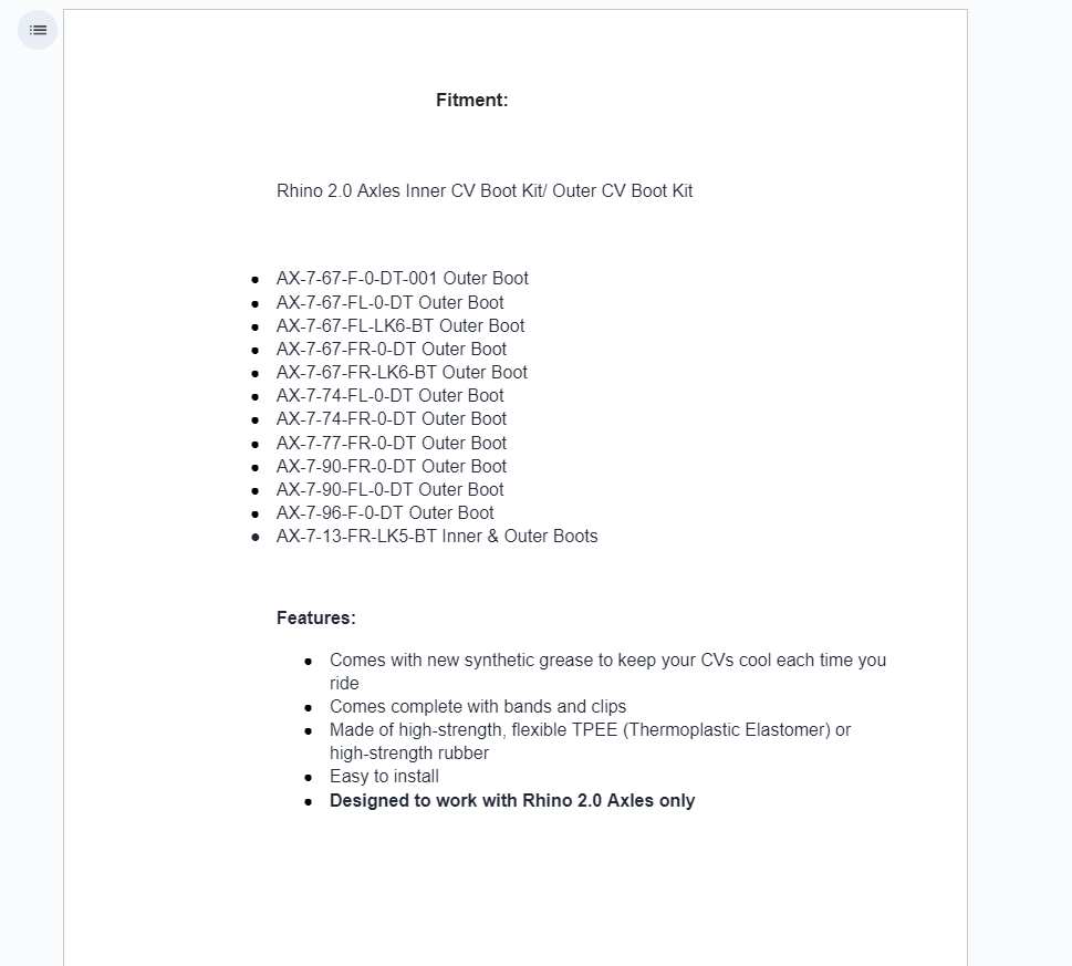 NOTE: These boots are designed to work with Rhino 2.0 Axles. The SKU number associated with your axle can be found on the shaft.