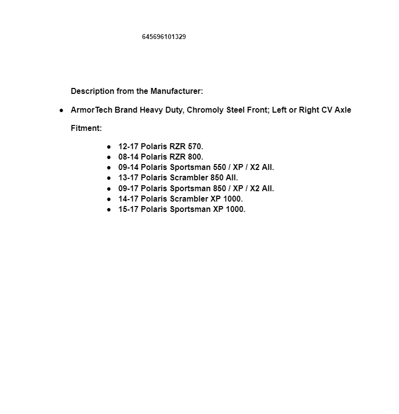 - ArmorTech Brand Heavy Duty, Chromoly Steel Front; Left or Right CV Axle