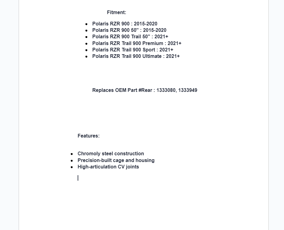 You pride yourself on taking care of your RZR—so why would you replace your axles with anything less than the best? SuperATV’s ADR Brand Polaris RZR 900 Axles are the best value axle you can find. If you need a replacement axle that isn’t going to break the bank and won’t let you down in tough situations, you need ADR Brand Axles.