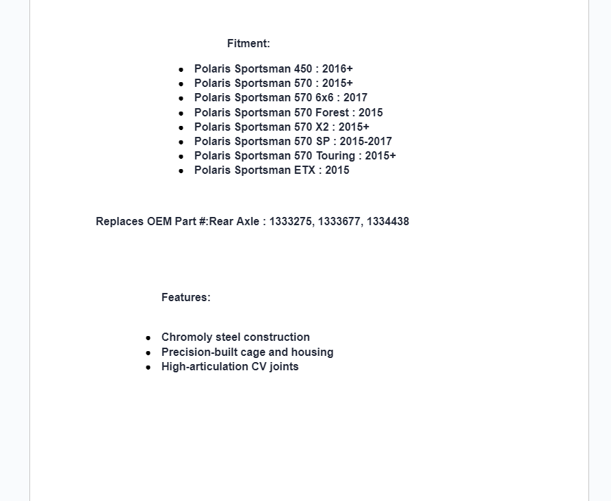 ADR replacement axles for the Polaris Sportsman are built with the same know-how and precision we put into our heavy-duty racing axles. You get chromoly steel construction, high articulation angles, and durable CV joints—all for less than the OEM would have you shell out for a stock replacement.