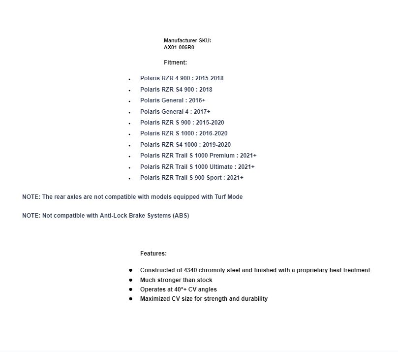When you’re rolling around on your RZR 4 900, you can tell that thing is powerful. It rolls through ditches and over logs easily… at least until you blow an axle. SuperATV’s Rhino 2.0 Axles are made specifically for your 900, and are better, stronger axles that keep you moving forward no matter what. Ride confidently on Rhino 2.0.
