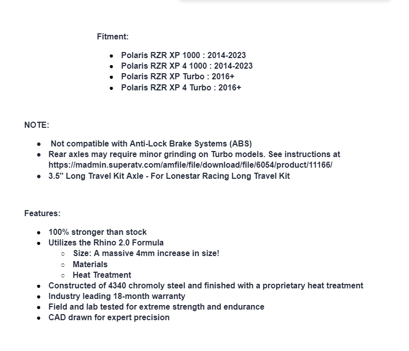 - Rear axles may require minor grinding on Turbo models. See instructions at https://madmin.superatv.com/amfile/file/download/file/6054/product/11166/