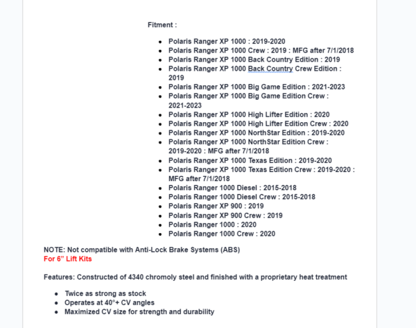 Let the Rhino Revolution redefine your Ranger XP 1000. Rhino 2.0 Axles are bigger, stronger, and built by expert riders that know the value of an axle that doesn’t quit. SuperATV’s Rhino 2.0 Axles combine maximized shafts and CVs with heavy-duty 4340 steel that’s heat treated for superior strength and longevity. The result is a heavy-duty axle that can handle 40°+ axle angles without binding or overheating and can handle massive torque without breaking. Let your Ranger be the work horse and the trail monster it’s built to be with Rhino 2.0 Axles.