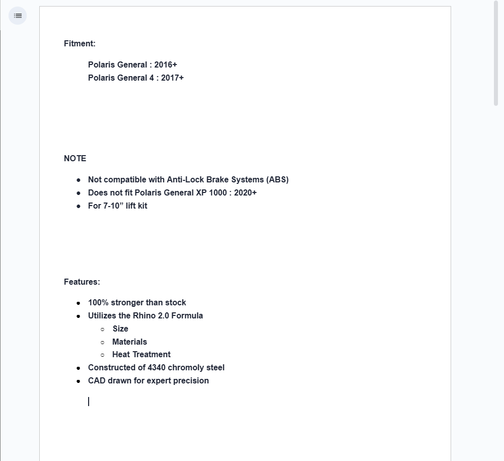 Let the Rhino Revolution redefine your Polaris General. Rhino 2.0 Axles are bigger, stronger, and built by expert riders that know the value of an axle that doesn’t quit. SuperATV’s Rhino 2.0 Axles combine maximized shafts and CVs with heavy-duty 4340 steel that’s heat treated for superior strength and longevity. The result is a heavy-duty axle that can handle 40°+ axle angles without binding or overheating and can handle massive torque without breaking. Let your General be the work horse and the trail monster it’s built to be with Rhino 2.0 Axles.